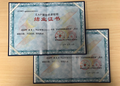华东公司段东之、段文佳考试合格并发放“EAP援助师培训班”结合证书。