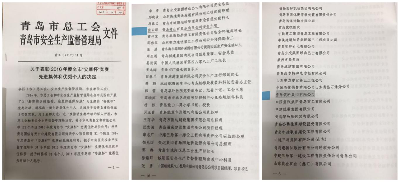 4月,集团荣获2016年度青岛市“安康杯”竞赛优胜单位